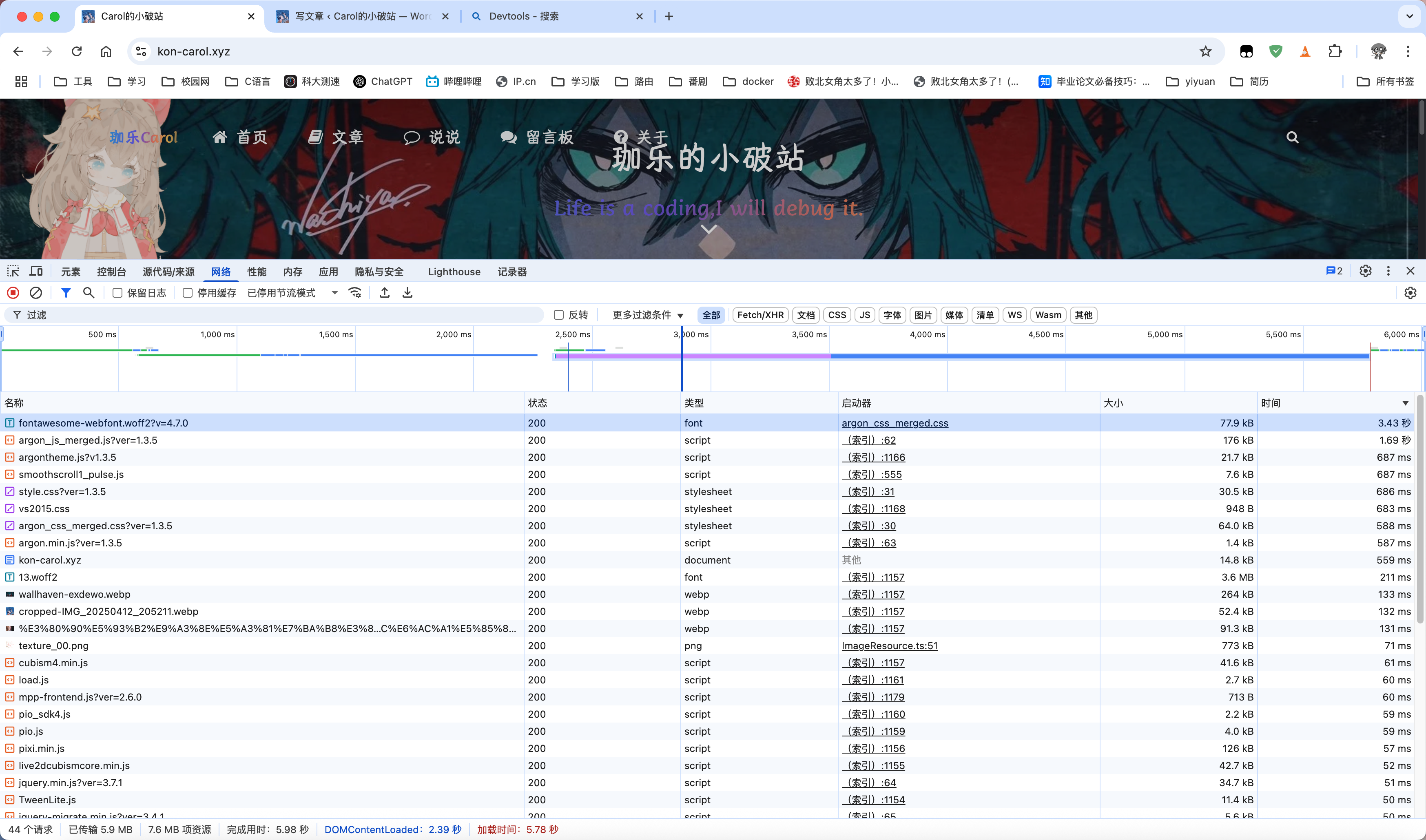 发现自己的网站加载慢,一定不要无脑去网上搜索优化教程。首先要确定是为什么自己的网站加载慢,我之前就是根本没有分析,直接跟着网上的教程走,优化了很久,发现根本没有作用。后来才利用Devtools分析各个资源的加载时间才解决。可以通过F12打开Devtools,右键清理缓存之后重新打开网站进行分析。